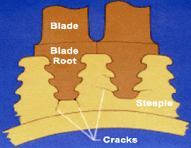 During blade removal, glass bead peening facilitated magnetic particle inspection. Cracks were found in most steeples, concentrated at stress-critical locations. Crack depths varied, with most being less than 10 mils, but a few approaching 15 mils.