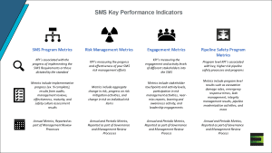 Pipeline Safety Program Metrics are ongoing metrics associated with high-risk processes that are likely to be a continued priority. Excavation damage rates, emergency response times, leak backlogs, integrity assessments, and bare steel or cast-iron mains replaced are examples of program-level metrics that are actively tracked and monitored throughout the year as part of an SMS.