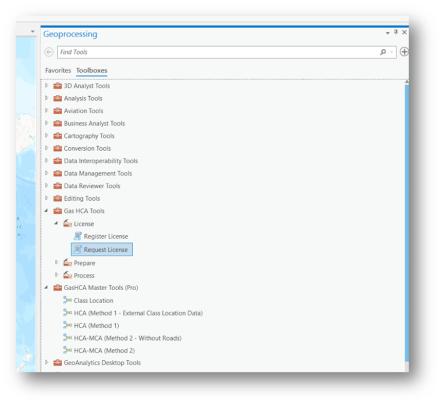 1. Open ArcGIS Pro and navigate to the Geoprocessing/Toolboxes. Here you will see two toolboxes for the Gas HCA Tool. Gas HCA Tool and Gas HCA Master Tools. Select the Gas HCA Tools toolbox. Then, select the License tool. Finally, navigate to and Select the Request License tool.