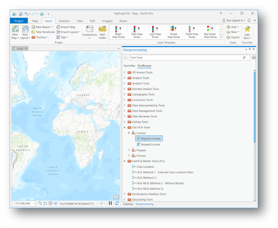1. Open ArcGIS Pro and navigate to the Geoprocessing/Toolboxes. Here you will see two toolboxes for the Gas HCA Tool. Gas HCA Tool and Gas HCA Master Tools.