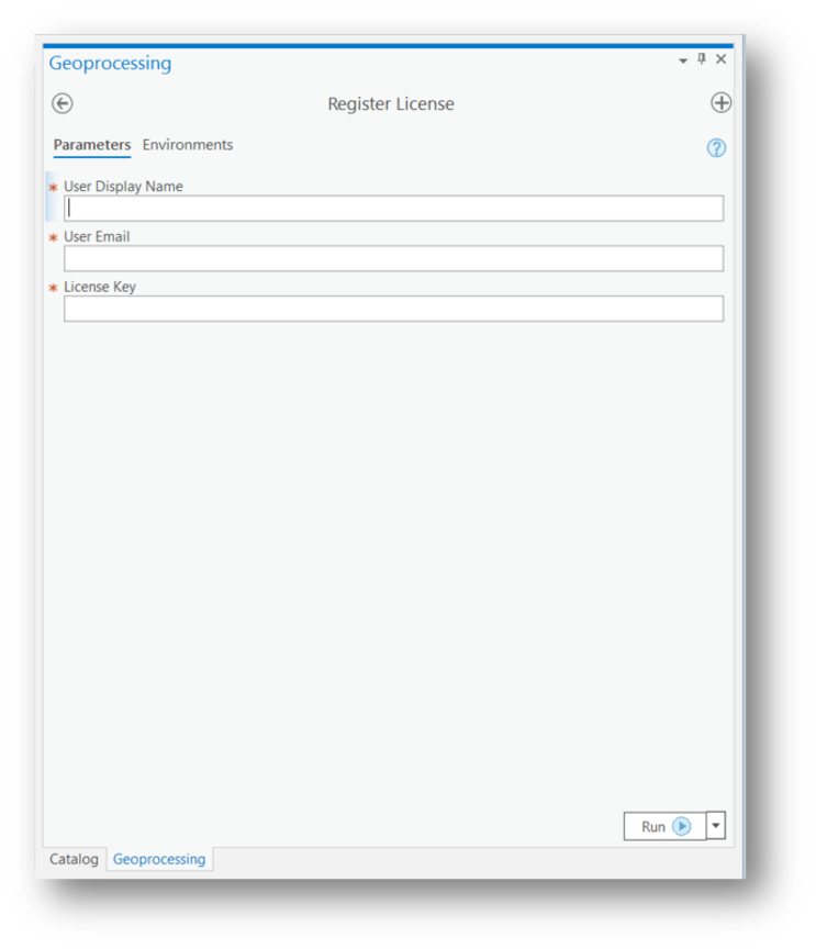 2. Double‑click on the Register License tool to open the tool and view its input parameter fields. Fill out the information requested by the tool and select ‘Run’ to register your tool.